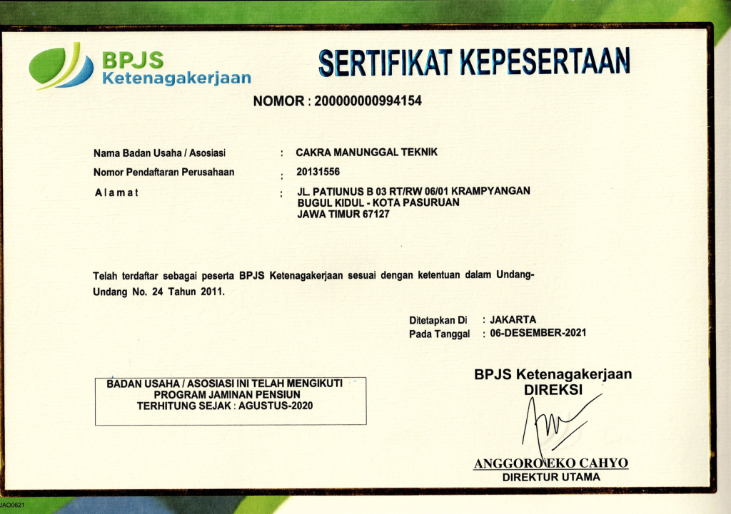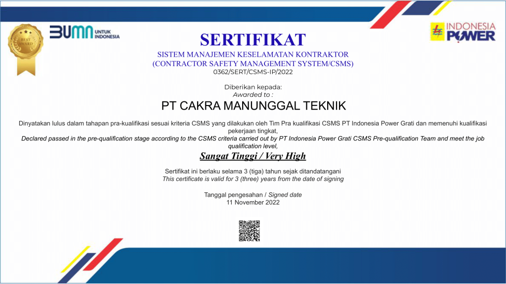 PT. Cakra Manunggal Teknik berdiri pada tahun 2019 di Pasuruan,Jawa Timur yang merupakan anak perusahaan dari PT. Indonesia Power Grati. Perusahaan bergerak pada bidang pemasok peralatan, pemeliharaan, dan konstruksi untuk sector pembangkit listrik. Bidang usahanya terdiri dari Mekanikal, Elektrikal dan Instrumen serta Sipil Engineer. PT. Cakra Manunggal Teknik telah menyelesaikan berbagai project mulai dari penggantian RTJ (Downcorner), pembuatan jalur evakuasi, pembuatan pipa line mesin, Rearrangement Air Barrier Fan GT 1.2, dan masih banyak lagi.